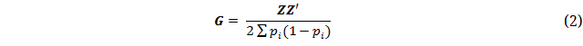 where pi is the minor allele frequency of ith SNP and Z = M − P. M is a matrix with SNP alleles coded as 1, 0, −1, and P is a matrix containing minor allele frequencies of SNP i calculated as 2(pi − 0.5). Missing genotypes were set to 0 in the Z matrix.