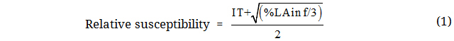 Statistical AnalysisDescriptive and summary statistics of infection types and the percentage of leaf area infected by both pathogens were calculated using the statistical software JMP 14.0.0 from [29]. Relative susceptibility was calculated based on [30], combining infection type and the percentage of leaf area infected (%LAinf) to receive robust and continuous data to estimate breeding progress for resistance. First, infection type data were transformed into continuous data based on [31]. Pearson’s correlation coefficients between transformed infection type data and the percentage of leaf area infected were calculated using the PROC CORR procedure of SAS 9.4, as implemented in JMP 14.0.0. Transformed infection type (IT) data were then combined with the percentage of leaf area infected (%LAinf), assuming a random distribution of square root values using Equation (1). Both transformed parameters contributed equally to the resulting parameter relative susceptibility.