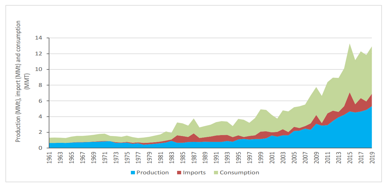 Figure 2. Wheat production, consumption and imports in Ethiopia from 1960–2020 [4].