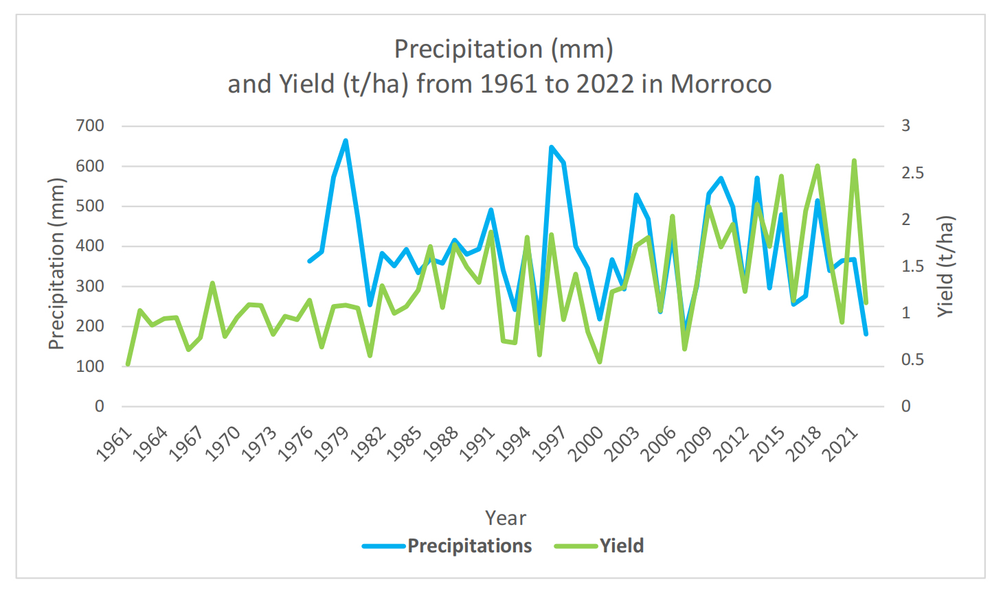 Figure 4. Precipitation and wheat yield in Morocco from 1961 to 2022 [2].