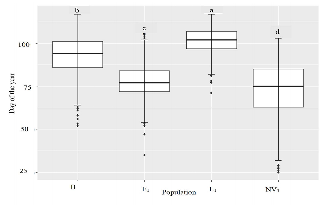 Figure 8. Box plot showing the difference in mean anthesis dates among annual ryegrass (Lolium perenne ssp. multiflorum (Lam.) Husnot) populations grown in Cycle1 (Fall 2023–2024). Different letters above the boxes indicate statistically significant differences (P < 0.01) among populations. Tukey’s LSD post hoc test was conducted for mean separation. B, E1, L1, and NV1 denote base population, early population, late population, and non-vernalizing population, respectively.