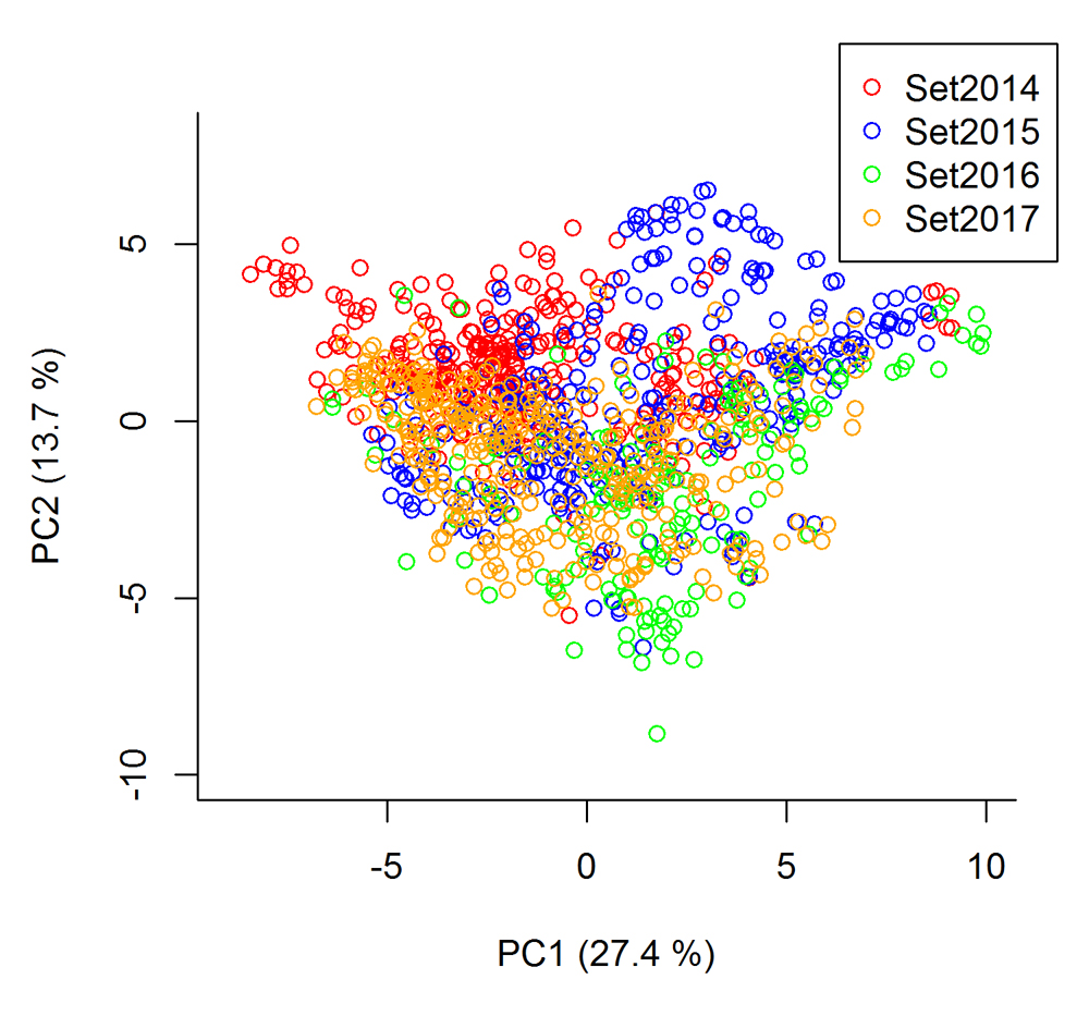 The principal component analysis of the G-matrix based on all 1152 lines, showed that the lines of each breeding set was not clearly separated from each other (Figure 1). The first principal component explained 27.4% of the variance, and the second principal component explained 13.7%.