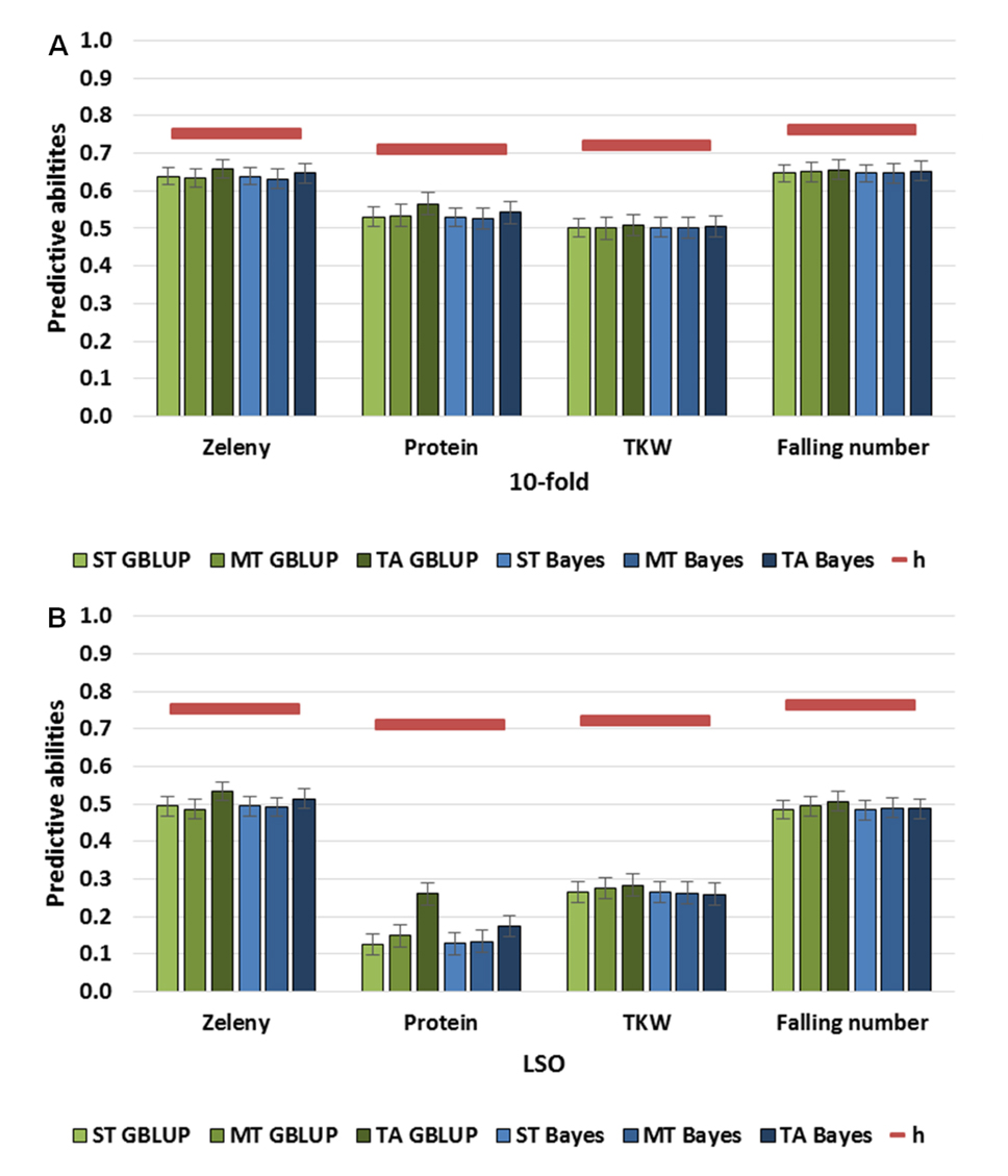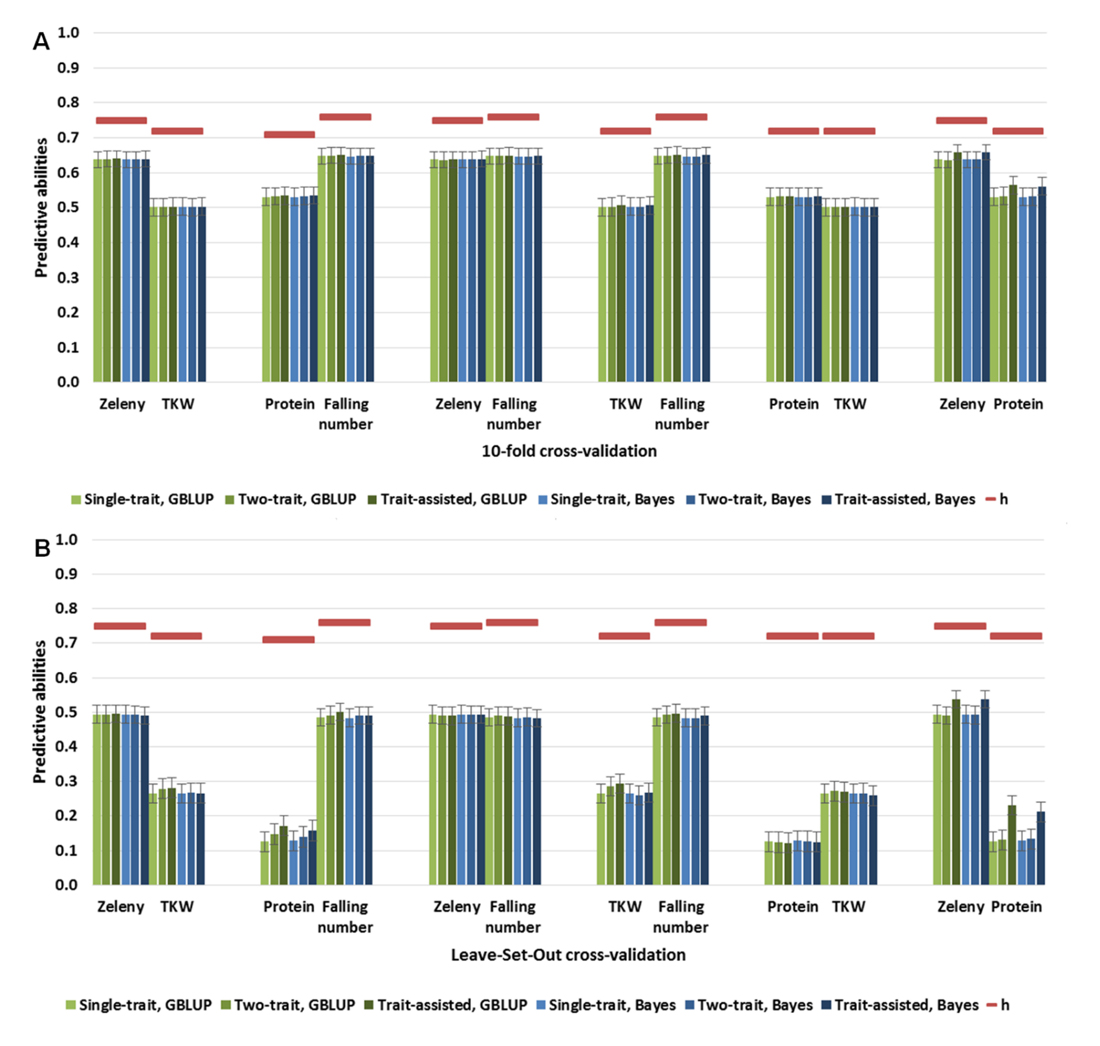 Figure 2. Predictive abilities of single-trait, multi-trait, and trait-assisted GBLUP (green) and Bayesian (blue) models. In the multi-trait models, all four quality traits were included, and the phenotypes were masked in the validation set. In the trait-assisted models, the phenotypes of three traits were known in the validation set, and the fourth trait was masked. The square root of the narrow-sense heritabilities (maximum predictive ability) are shown as red lines. (A) 10-fold cross-validation, (B) Leave-Set-Out cross-validation.