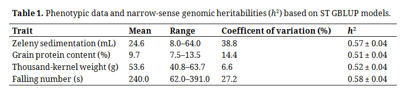 In total, 1152 winter wheat lines from four different breeding cycles, set2014–set2017, were phenotyped for the quality traits Zeleny sedimentation, grain protein content, TKW, and falling number (Table 1). Estimates of narrow-sense genomic heritabilities, h2, for plot records ranged from 0.51 for grain protein content to 0.58 for falling number.