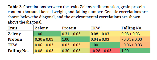 The genetic and environmental correlations between the traits are shown in Table 2. Grain protein content and Zeleny sedimentation were positively correlated both genetically and environmentally. Grain protein content was also genetically correlated with falling number, and the environmental correlation between the two traits was close to zero. Falling number had a negative genetic correlation with TKW and nearly no environmental correlation.