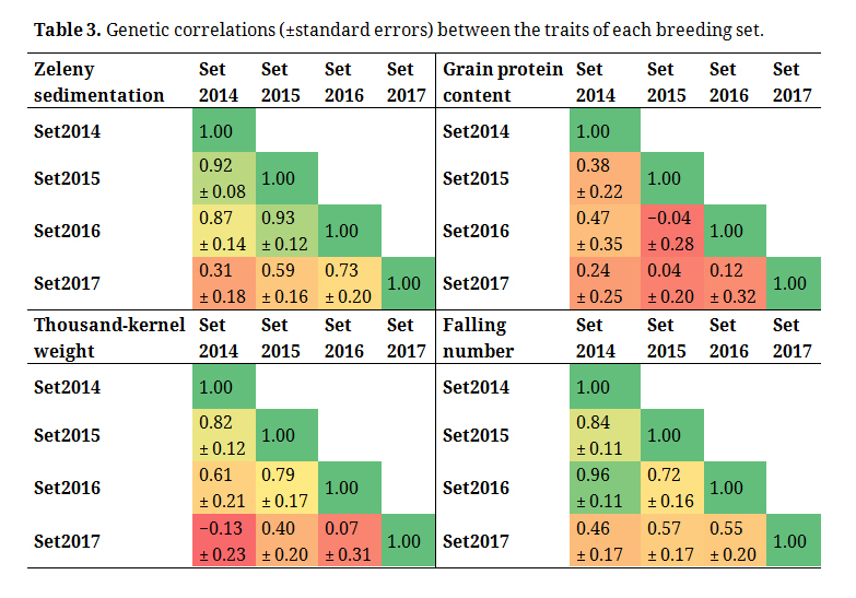 MT models, where a trait recorded in each of the four breeding sets was considered as four different traits, showed that the estimates of the genetic correlations between the traits of each set varied considerably (Table 3). However, the standard errors of the correlations were quite large, especially for grain protein content. For grain protein content and for TKW, the genetic correlations were close to 0 or even slightly negative between some of the sets. For Zeleny sedimentation and for falling number, the genetic correlations were positive between all sets, and the correlations were relativity high in most cases.