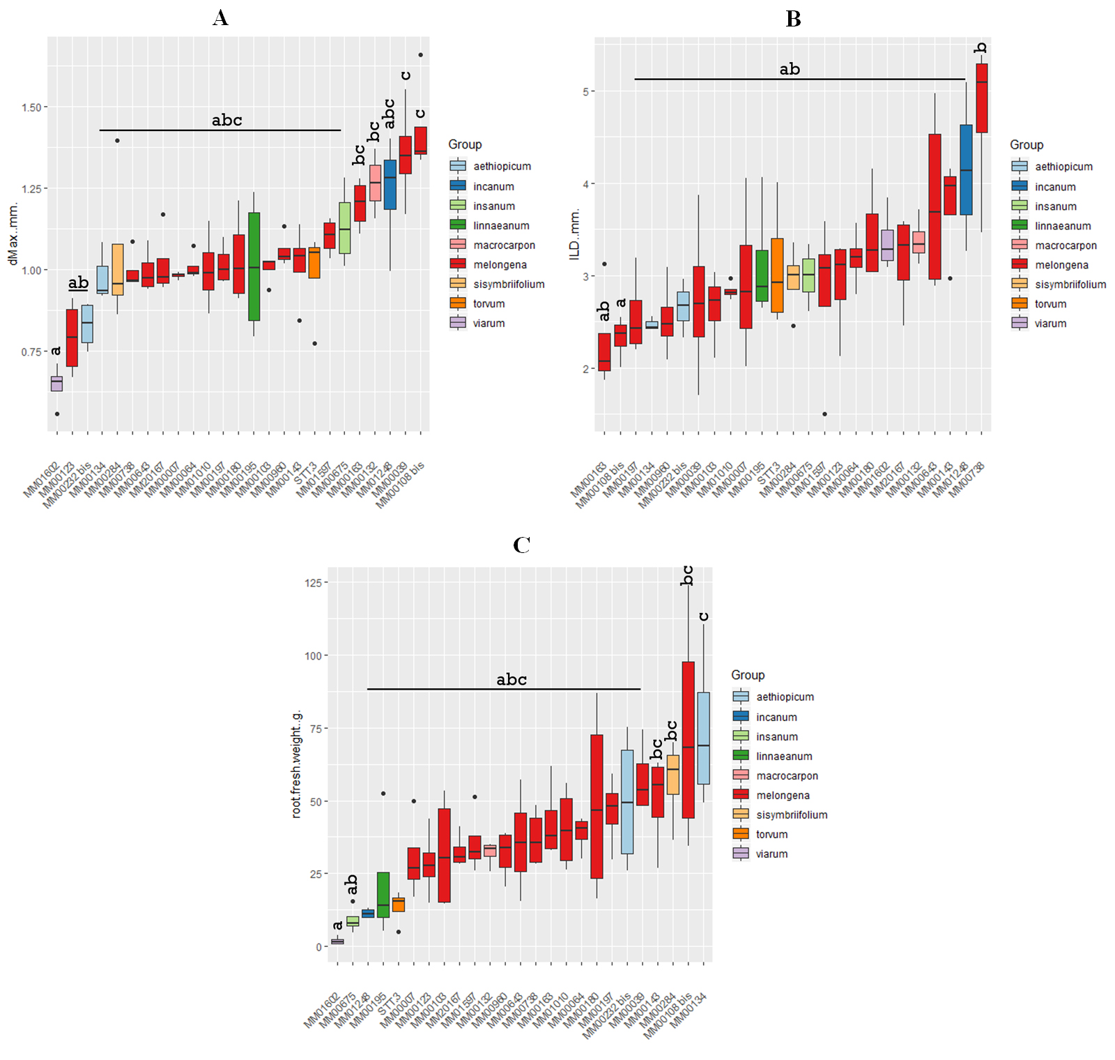 Figure 1. Boxplots representing measurements of maximum root diameter in mm (A), inter-lateral distance in mm (B) and root fresh weight in grams (C). The median is represented by the line across the middle of the box, the end of the box shows the upper and lower quartiles and the vertical line shows the highest and lowest values except for the outliers which are represented by a dot. For each accession a total of 4 independent plants were used. For the maximum diameter and inter-lateral distance, a minimum of two roots were excised from the base of the tube where the thickest roots were found, roots were washed and scanned and a minimum of 15 measurements were made per trait and per scan. For the root fresh weight, roots from four different plants per accession were washed and patted dry before being weighed. The different colours are used to differentiate the nine different species of aubergine and wild relatives. Data presented is from the experiment carried out at Site G. Statistical groups (A, B or C) were assigned following an Analysis of Variance with a post-hoc Tukey test at a 5% significance level.