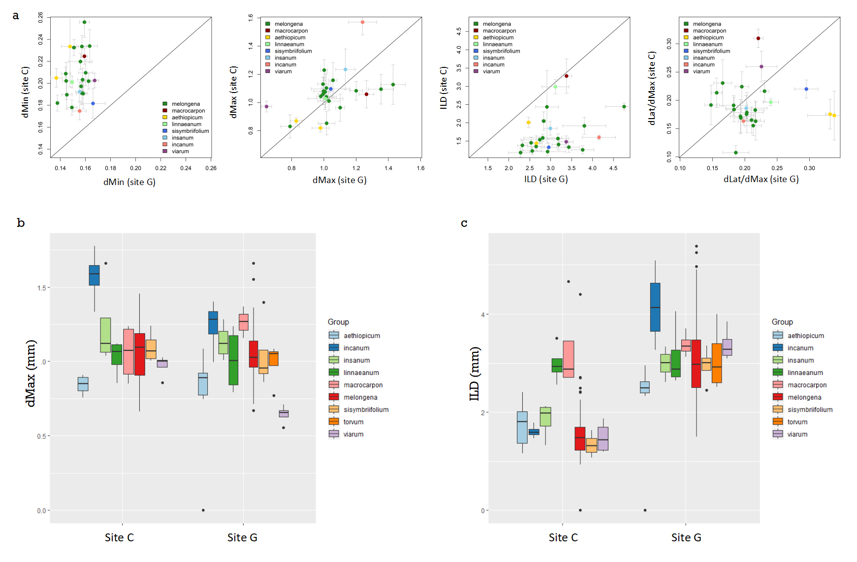 Having established that there is an interaction between genotype and site we can ask whether certain accessions or species show trait stability in the two environments. Figure 2a shows, for the root traits, correlations between the two sites, we note that dMin and ILD are different depending on the site where the measurements were carried out whereas dMax and dLat/dMax appear to be better correlated. Figure 2b shows the detail of the results for dMax for each species, where no significant effect of the site was detected, so the trait distributions for each group are similar: the S. incanum group had the highest values of dMax at each site and the S. aethiopicum group amongst the lowest. In contrast, the ILD trait is affected both by the site and by a genotype x site interaction (Figure 2c; Supplementary Table S2). For this trait, the differences between the groups are not identical for the two sites: it is however notable that the S. linnaeanum and the S. macrocarpon accessions have stable ILD values over the two sites and therefore these accessions show little genotype x site interaction compared to the other groups for this root trait.
