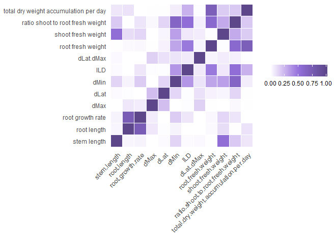 The correlations between sites for each trait are shown in Table 4 and lead to similar conclusions. Firstly, not many traits are correlated between the two sites because of the interaction between genotype and site mentioned above: however the traits that do have an R2 above 0.4 and a significant p value are: stem length, shoot fresh weight, root fresh weight per day, shoot fresh weight per day, shoot dry weight per day and total dry weight accumulation per day. Therefore some of the fresh weight/dry weight traits, particularly related to the stem show correlations between the two sites. An analysis of heritability using the data from both sites revealed that dMax and the plant traits (stem length, shoot dry weight and total dry weight accumulation per day) had the highest heritability and were therefore under the most genetic control compared to the other traits.