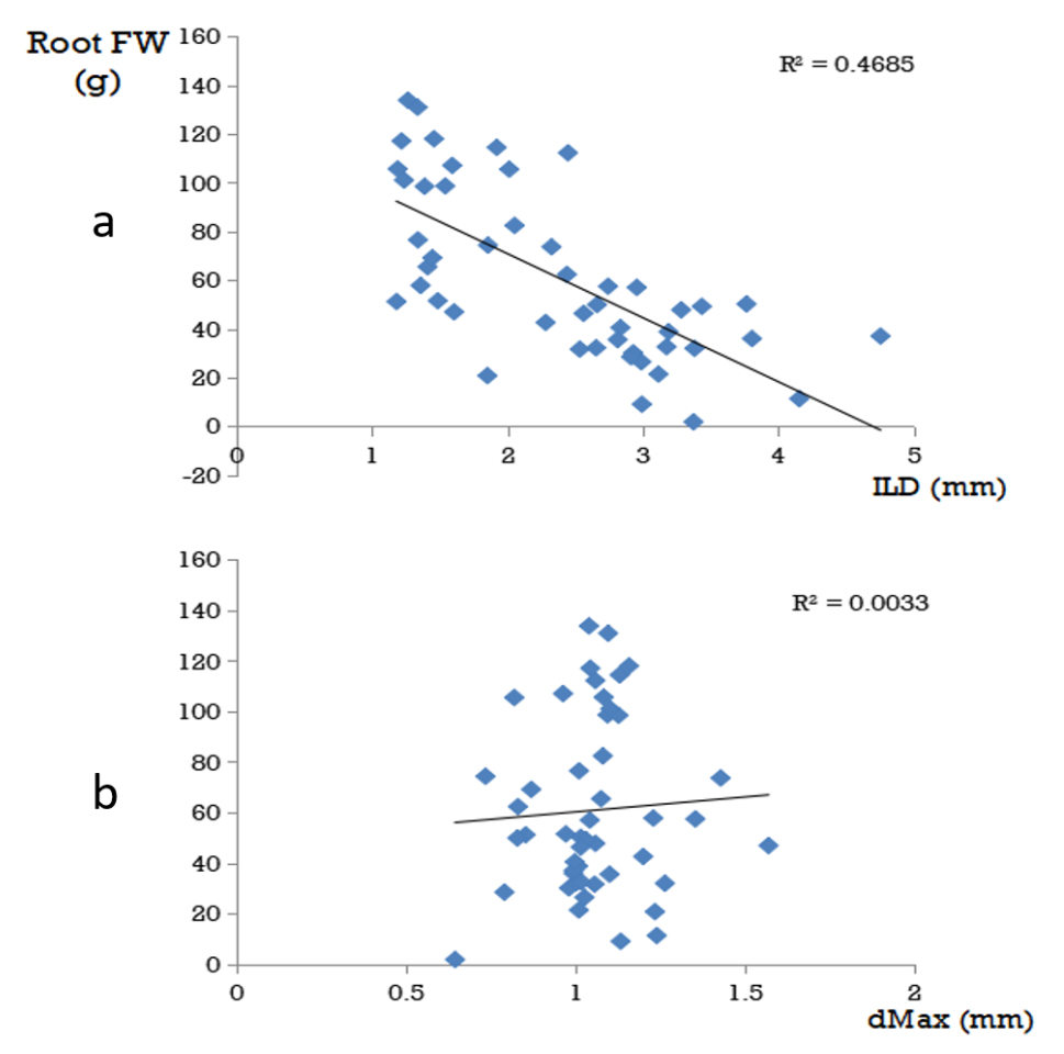 Figure 4. Detail of the correlation shown in Figure 3 for inter-lateral distance (a) and maximum diameter (b) with root fresh weight. Each point on the graph represents the average value of an accession at one of the two sites. The line is the line of best fit for the linear regression and the R2 value for the determination coefficient of the line.