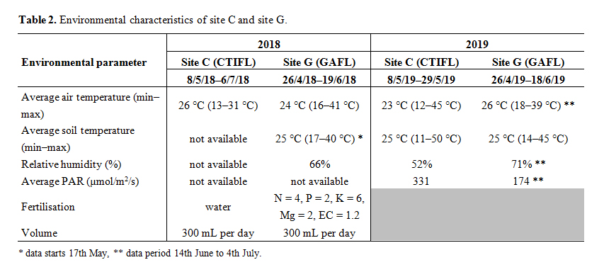 For each accession, 4 plants were analysed at each site. The experiment was carried out at INRA GAFL, Montfavet (site “G”, seeds sown on the 26th April or the 4th May 2018—2 plants per accession for each sowing date) in a glasshouse or at the Centre Technique Interprofessionnel des Fruits et Légumes (CTIFL) at Balandran (site “C”, seeds sown on the 7th or 14th May 2018—2 plants per accession for each sowing date) in a plastic tunnel. Plants and roots at site G were harvested between the 5th and 13th June (for plants sown on 26th April) or the 14th and 19th June (plants sown on 4th May). Plants and their roots at site C were harvested on the 27th June (plants sown on 7th May) or 6th July (plants sown on 14th May). The culture at site C did not include the S. torvum accession because the seeds did not germinate. The environmental characteristics at each site are presented in Table 2 and include air temperature, substrate temperature, relative humidity, photosynthetically active radiation (PAR) and the fertilisation regime. As the environments were not equipped in 2018 for all measurements of environmental parameters, measurements are also included from approximately the same period in 2019.