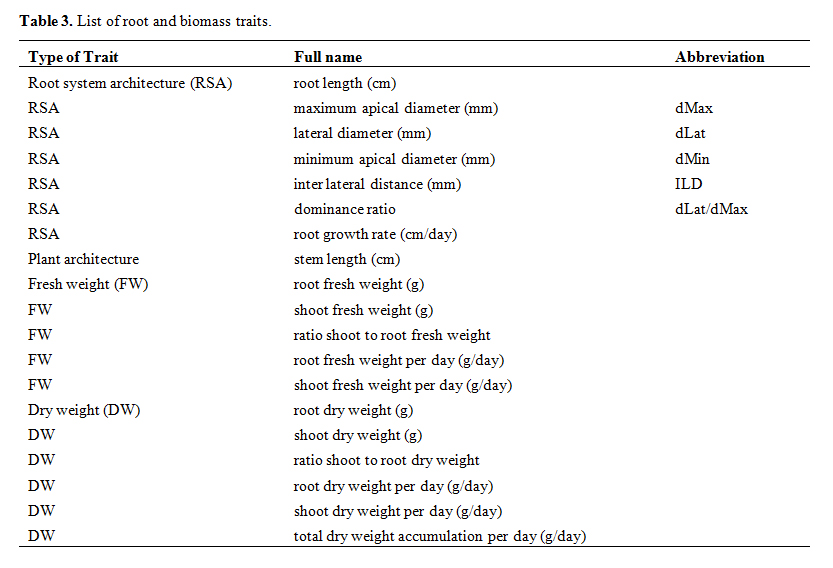 There are numerous phenotyping methods possible for root architecture, [25], each method having specific advantages and disadvantages. The method we have chosen for this study [12] has the advantage of allowing us to work on relatively mature plants (i.e., not seedlings) and so the root architecture has time to develop its potential, we are also able to analyse detailed traits that would not be possible in the field where many roots are broken and fine roots lost. Compared to phenotyping in the field, our method does present certain disadvantages as we do not have an idea of global traits such as the width or volume of the root system. Indeed these are often the traits associated with stress tolerance such as adaptation to drought as illustrated in Comas et al [9], where traits such as increased root biomass, root length density and root depth are associated with drought avoidance in several important crops (rice, maize). It would therefore also be of interest to compare phenotypes obtained in the field for our genotypes.
