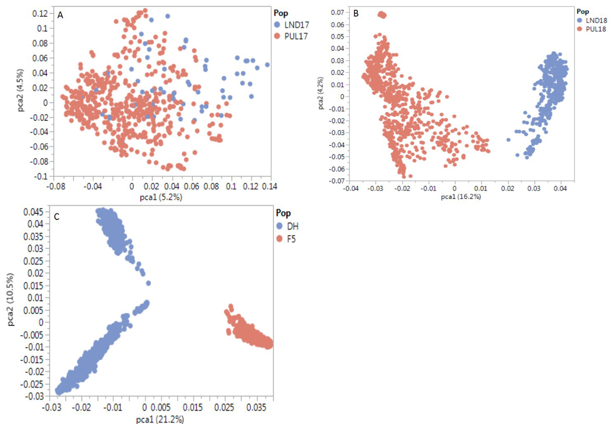 Analysis of principal components using genome-wide marker data revealed a 5.2% variation caused by the first PC (PC1) and 4.5% by PC2 within the F5 breeding lines, with no distinct clustering observed (Figure 1A). PC1 and PC2 caused 16.2 and 4.2% of variation, respectively within the DH lines (Figure 1B) with more differentiation observed compared with the F5, where the DH_LND lines formed a separate cluster with that of the DH_PUL lines. When combined on a single PCA biplot, the F5 lines formed a separate group from that of the DH lines, where the first PC caused 21.2% and the second PC caused 10.5% of variation. The DH entries formed separate clusters, indicating a higher genetic differentiation among them (Figure 1C). Genetic (Rogers) distances among the breeding lines were 0.05 (F5), 0.13 (DH) and 0.40 (F5 and DH).