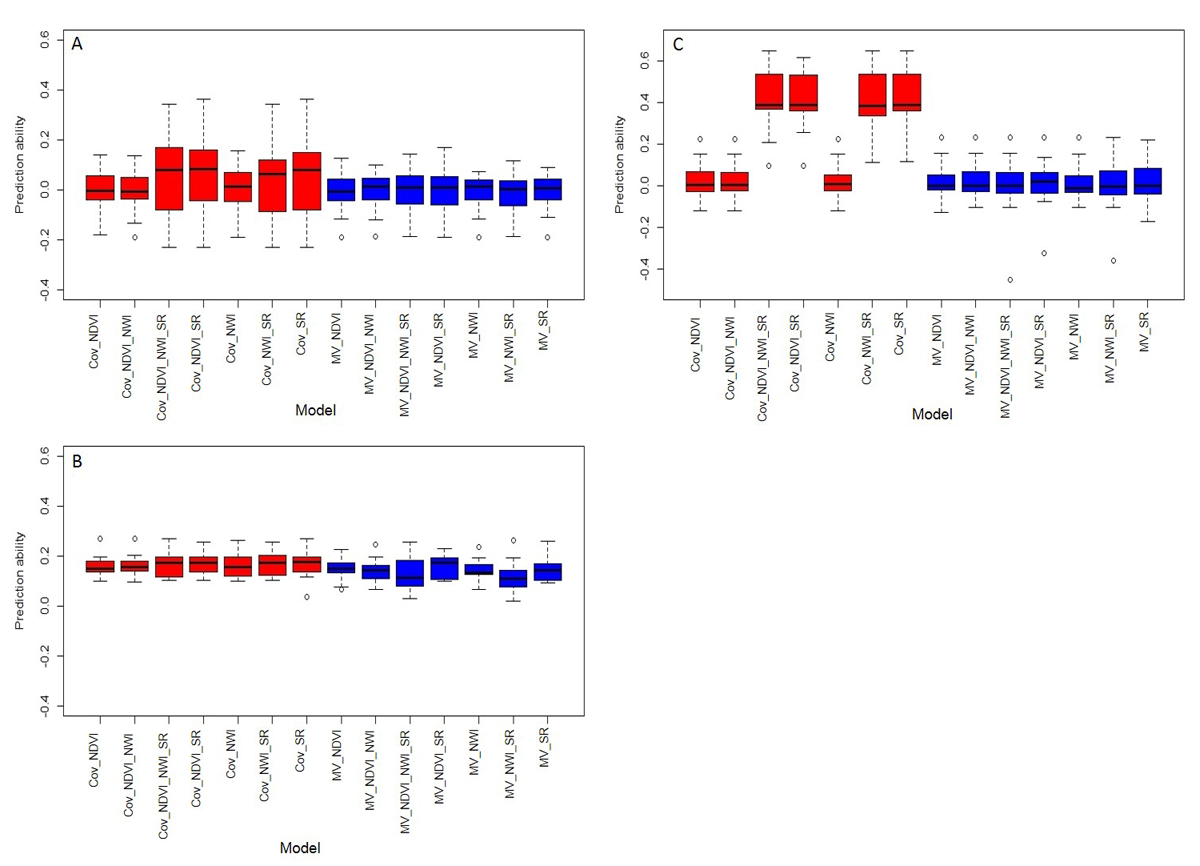 Figure 2. Boxplots of prediction ability for grain yield under different genomic selection scenarios using covariate (Cov) and multivariate (MV) partial least square regression models incorporating spectral reflectance traits. (A) cross validations using a diversity association mapping panel (DAP); (B) independent predictions using DAP to predict F5 and DH winter wheat breeding lines; and (C) independent predictions within the breeding lines. Actual values for prediction ability are reported in Supplementary Table S5. NDVI, Normalized Difference Vegetative Index; NWI-1, Normalized Water Index-1; SR, Simple Ratio.