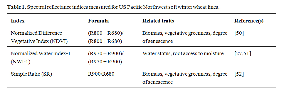 Table 1. Spectral reflectance indices measured for US Pacific Northwest soft winter wheat lines.