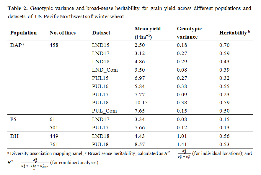 Table 2. Genotypic variance and broad-sense heritability for grain yield across different populations and datasets of US Pacific Northwest soft winter wheat.