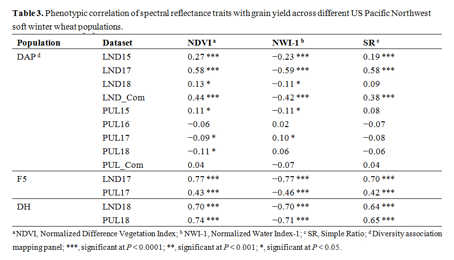 Table 3. Phenotypic correlation of spectral reflectance traits with grain yield across different US Pacific Northwest soft winter wheat populations.