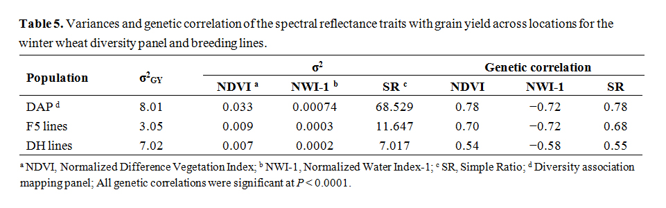 Table 5. Variances and genetic correlation of the spectral reflectance traits with grain yield across locations for the winter wheat diversity panel and breeding lines.