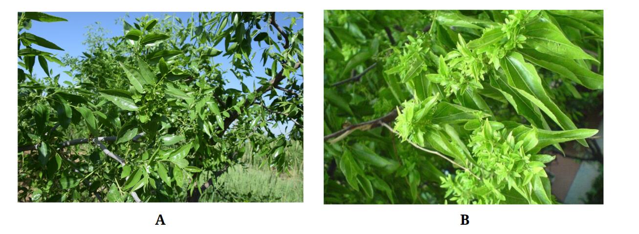 Jujube Witches’ BroomJujube witches’ broom (JWB), associated with phytoplasma presence, is an extremely destructive disease commonly found in both North and South China [15], as well as in India [16], Korea [17,18] and Japan [19]. This important and damaging disease has caused yield reductions ranging from 10% to 80% [20,21]. A severely infected tree will die within two to five years [21,22], resulting in million tree deaths by JWB each year in China [22]. Phytoplasmas, or mycoplasma-like organisms (MLO) are plant pathogenic bacteria which lack cell walls and are transmitted by insect vectors. They inhabit phloem; spreading through the plant by way of this vascular tissue [23]. A tree infected with phytoplasmas typically displays severe rosetting, little green leaves and a witches’ broom-like appearance (Figure 2). Based on analysis of ribosomal (16Sr) sequence, Jung et al.(2003) proposed that the phytoplasmas associated with jujube JWB disease in Korea and Japan were designated as a novel, distinct taxon, namely “Candidatus Phytoplasma ziziphi” [18]. The same species was also identified in JWB-infected wild jujube in China [24,25]. The insect vector transmitting JWB is the leafhopper Hishimonus sellatus (Uhler) [21,26,27]. JWB phytoplasmas have been identified solely from jujube trees, which suggested that the feeding preferences of H. sellatus, rather than the resistance of other potential plant hosts may be responsible for this specificity [18].
