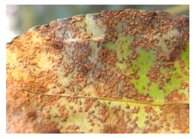 Jujube Leaf-RustJujube leaf rust disease, caused by Phakopsora zizyphi-vulgaris (P. Henn), is another serious threat to jujube production [32–34]. Rust mainly occurs on leaves and less commonly on fruits. Since an outbreak of rust disease in Henan, China in 2004, rust has become the most important disease affecting winter jujube production in this region [9]. Based on a survey between 2004 and 2008 in Shandong, China, Yan and Wang reported that rust disease can reduce jujube yield by 10% to 50% [35]. In the 1970, an 85% yield reduction was recorded in Neihuang district, Henan Province, China, during a rust disease outbreak. Since rust disease coincides with fruit development, it also contributes to fruit shrinkage and quality deterioration, and the produced toxic substances can make the fruit inedible [6,35].
