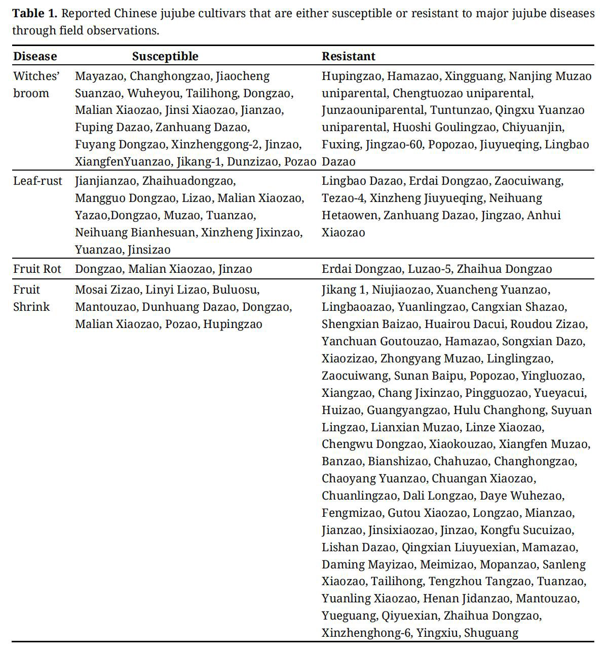 Host resistance is expected to be the most efficient way to cope with the above mentioned four major diseases/disease complexes in jujube. A substantial amount of research has been carried out in breeding disease resistant jujube cultivars in China [9,13], and research investment is increasing. Breeding efforts have primarily focused on witch’s broom, fruit shrinkage and various fruit rot diseases. The breeding approaches range from germplasm evaluation, selection of farmer cultivars and introgression of host resistance from wild relatives [7,13]. Nonetheless, an updated analytical summary of these efforts is not available. Moreover, most of this research has been published in Chinese or as informal publications, and thus are not readily accessible by the international community. Herein we summarize the on-going research activities in jujube disease resistance breeding in China, with the aim to identify knowledge gaps that when filled will improve the effectiveness of jujube breeding for enhanced disease resistance. Due to the space limit, we will only review the four major diseases as mentioned above.