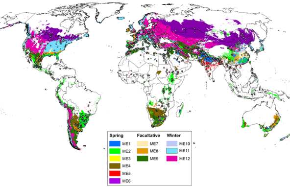 Figure 2. Mega-environments (MEs) and >700 testing sites of the International Wheat Improvement Network. Breeding is directed towards 12 different mega-environments (see box), representing a range of temperature, moisture, and disease profiles, based on up-to-date GIS and economic information (From Reynolds and Pinto [42]).