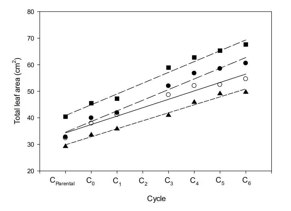 In this project, the scientists conducted a global survey to assess early vigor across more than 5,000 wheat varieties, breeding lines and landraces with the aim to identify genetically unrelated sources of early vigor for use in breeding. This was the crop design and hypothesis phase. After standardizing for differences in seed size, the scientists compared varieties to confirm the conservative growth of wheat compared with barley [45]. They also identified 28 high vigor genotypes from India, China, Israel, Canada, Mexico and elsewhere and assembled them into a large S1 recurrent selection program. Each cycle comprised growing 6000 F2 progenies from 60 biparental crosses. Elite progenies were retained and tested to identify the 120 widest-leafed S0:1 families for crossing and development of the next cycle of selection. This was repeated six times over a period of 15 years [49]. Thirty families were retained from each selection cycle and, when the authors compared them in four sowings, they found the varieties had established a near 40% increase in leaf area as a result of selection for greater leaf width (Figure 3).