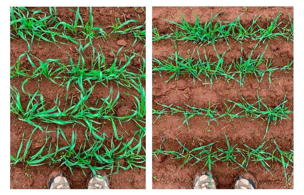 The capacity to integrate across multi-stage selection activities (i.e., combine selection for greater early leaf area and then alternative dwarfing genes) in delivering new high early vigor wheats is shown in Figure 4 where a high vigor, dwarf wheat breeding line is shown together with a high vigor barley variety sown in the same experiment. The figure highlights the increased early growth in wheat and its capacity to shade the soil and reduce soil-water loss through soil evaporation. The greater early ground cover of the new wheat is also important in achieving greater crop-weed competitiveness [53,54].