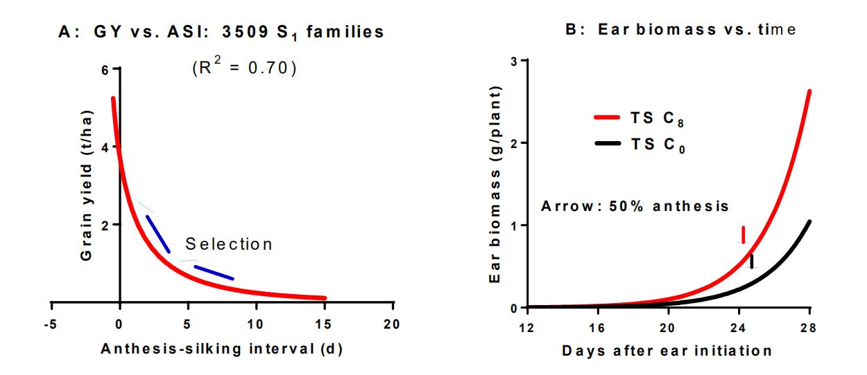 Figure 6. (A) General relationship between grain yield (GY) and ASI in 3509 S1 families of tropical maize evaluated under a range of water deficits, Mexico. Selection arrows show the direction of changes towards higher GY and lower ASI [59]. (B) Ear biomass vs days from ear initiation in selection cycles of Tuxpeño Sequía (TS) evaluated under a range of plant densities [60].