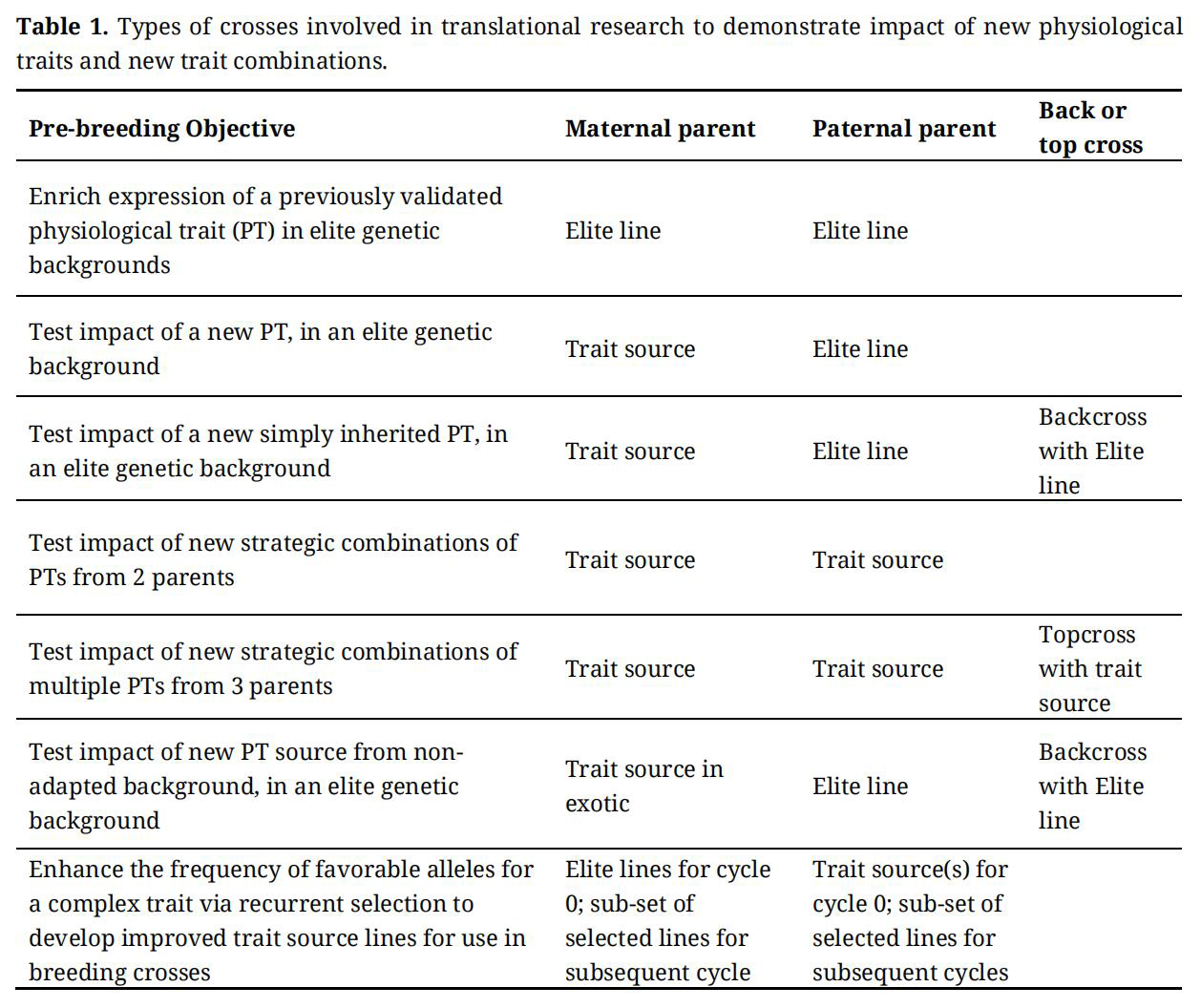 Crosses involving new traits/alleles provide the definitive experimental platform for quantifying genetic gain, while the effectiveness of new screening technologies can be rigorously tested through well-controlled progeny selection. However, different kinds of crosses and selection processes are applied depending largely on trait heritability and genetic backgrounds. Where a trait has a relatively simple genetic basis and is either associated with reliable molecular markers or a heritable phenotype, backcrossing into a range of elite breeding lines is the favoured and fastest approach. However, yield and many of its physiological drivers are complex, so simple backcrossing and use of markers is not generally an option. Different crossing strategies and their objectives are summarized in Table 1.