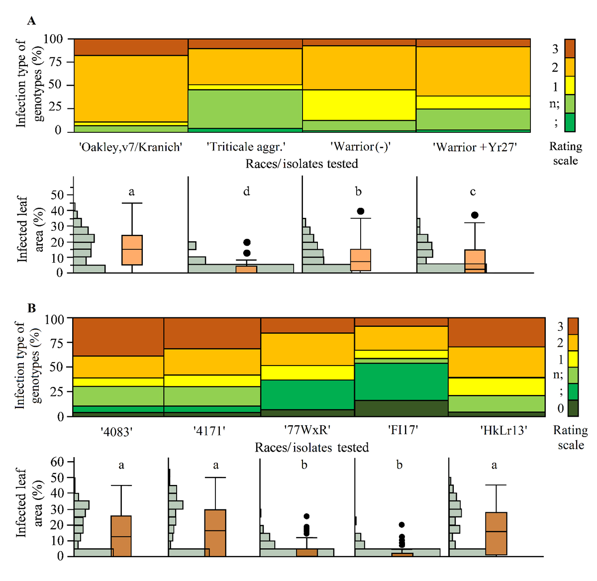 Figure 1. Analysis of susceptibility of 191 winter wheat cultivars to different isolates of P. striiformis and P. triticina. Mosaic plots of contingency tables of infection types for isolates of stripe rust (A) and leaf rust (B) and illustration of class frequencies and boxplots of infected leaf area (%) by isolate with letters (a, b, c, d) representing groups of isolates with significant pairwise differences tested by Tukey Kramer HSD.