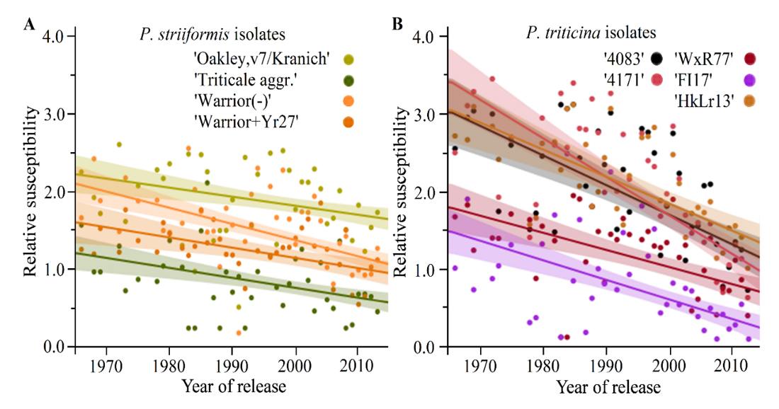 Figure 2. Breeding progress against different isolates of P. striiformis and P. triticina. Linear trend lines (each shaded with 95% confidence interval) of relative susceptibility against different isolates of stripe rust (A) and leaf rust (B) based on the relative susceptibility values of 191 winter wheat cultivars in relation to the year of cultivar release.