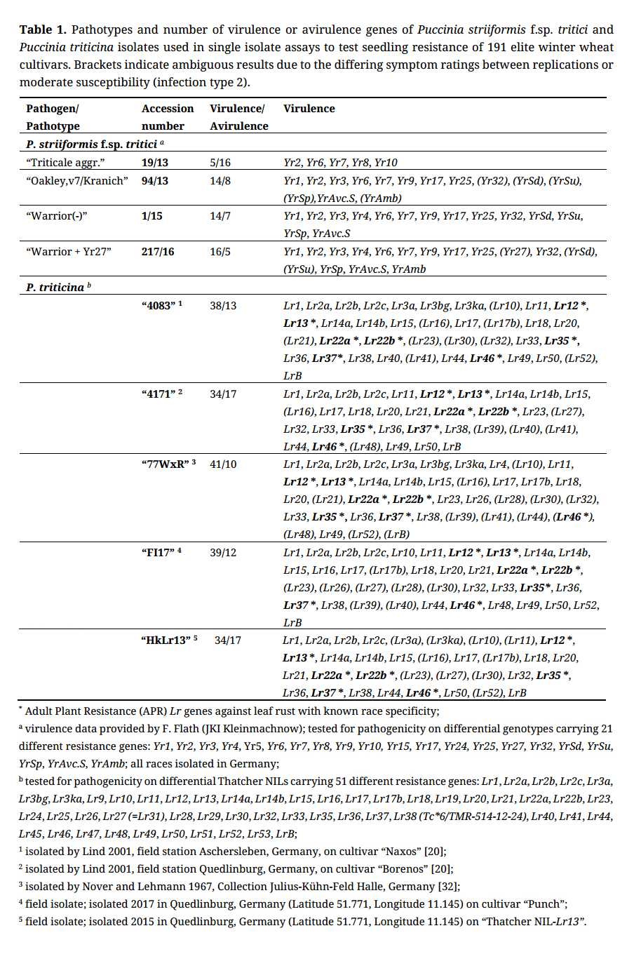Table 1. Pathotypes and number of virulence or avirulence genes of Puccinia striiformis f.sp. tritici and Puccinia triticina isolates used in single isolate assays to test seedling resistance of 191 elite winter wheat cultivars. Brackets indicate ambiguous results due to the differing symptom ratings between replications or moderate susceptibility (infection type 2).