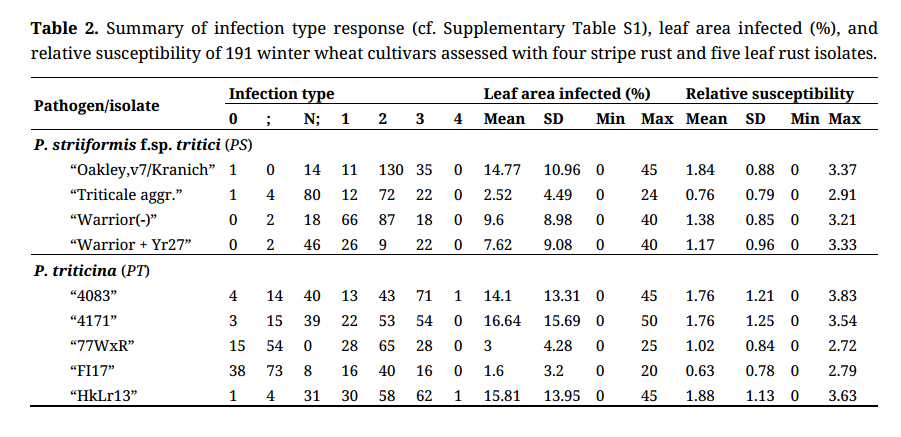 Table 2. Summary of infection type response (cf. Supplementary Table S1), leaf area infected (%), and relative susceptibility of 191 winter wheat cultivars assessed with four stripe rust and five leaf rust isolates.