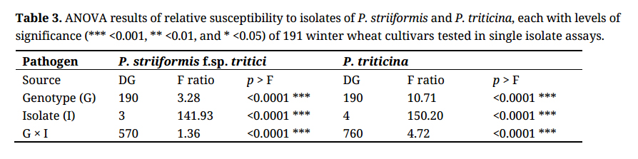 Table 3. ANOVA results of relative susceptibility to isolates of P. striiformis and P. triticina, each with levels of significance (*** <0.001, ** <0.01, and * <0.05) of 191 winter wheat cultivars tested in single isolate assays.