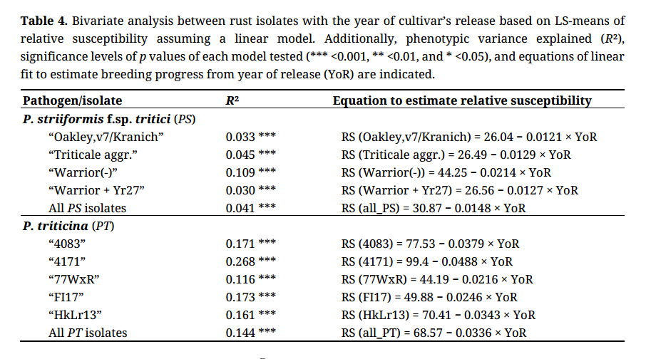 Table 4. Bivariate analysis between rust isolates with the year of cultivar’s release based on LS-means of relative susceptibility assuming a linear model. Additionally, phenotypic variance explained (R²), significance levels of p values of each model tested (*** <0.001, ** <0.01, and * <0.05), and equations of linear fit to estimate breeding progress from year of release (YoR) are indicated.