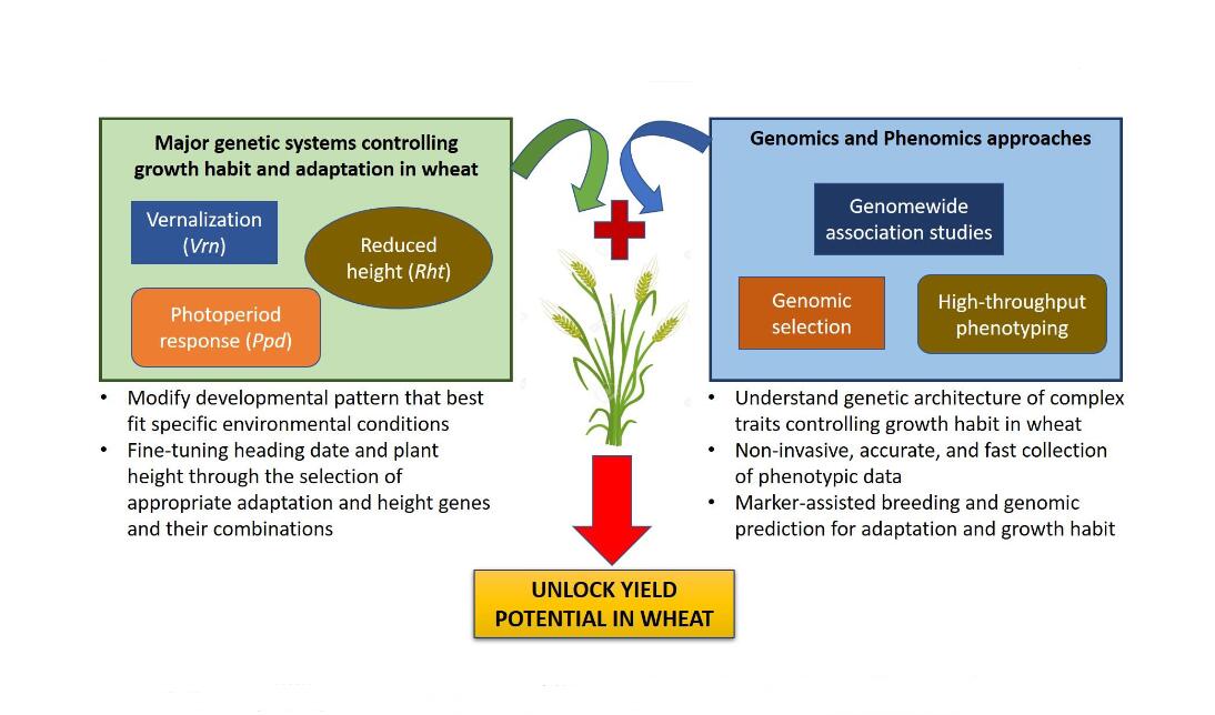 Figure 1. A key to unlocking yield potential in wheat is through understanding the genetic architecture of growth habit and adaptation traits using genomics and phenomics approaches. Selecting the appropriate alleles and their combinations that suit specific growing conditions (e.g., well-watered or drought-stressed environments) would facilitate improvement of yield and yield potential.