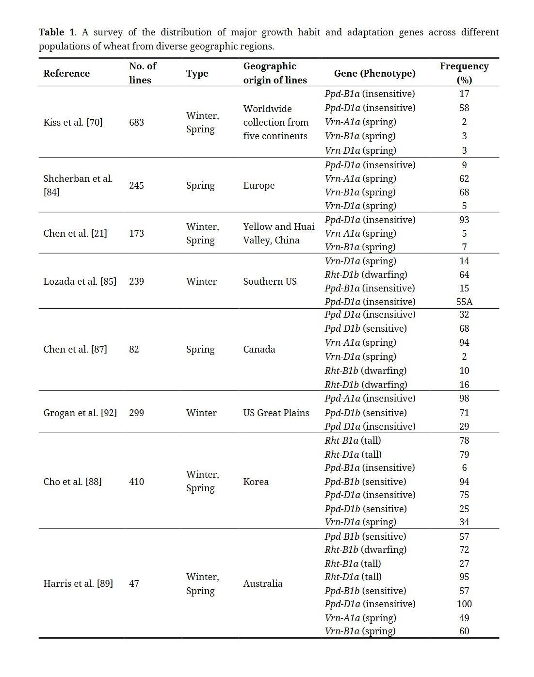 Selection for increased adaptation of wheat in various growing regions can be demonstrated by the allelic variation of growth habit and adaptation genes present across different breeding populations (Table 1). The frequency of alleles controlling response to vernalization is mainly dependent on whether spring or winter wheat types are required for specific regions or environments. Vrn-A1a and Vrn-B1a, for example, were predominant in a population of 245 spring bread wheat lines from Europe [84], whereas a worldwide collection of wheat lines across five different mega-environments had < 5% of these Vrn spring alleles present [70]. The semi-dwarfing Rht-D1b was observed to be the main allele controlling shorter stature in southern US winter wheat lines [85,86], whereas Rht-D1a had higher frequency in wheat breeding lines from Canada [87] and Korea [88]. In a worldwide collection of both winter and spring types of wheat, Ppd-D1a, which controls insensitivity to day length, was found to be present in 58% of the lines evaluated [70]. The higher frequency of this Ppd insensitivity allele for wheat lines from Australia [89], China [21], Korea [88], and southern US [86] further demonstrates the positive selection for early flowering types of wheat. Early flowering wheat ideotypes were related with improved grain yield potential based on crop modeling studies for future climate change scenarios. An ideotype with earlier flowering time, longer grain filling, larger maximum grain size, and larger radiation use efficiency among others was predicted to be “ideal” for a “wet” South Eastern Australian environment based on recent simulations done using Global Climate models [90]. Accelerating the rate of crop development through early flowering and maturity by adjusting daylength response was also found to be optimal for improved yield potential under drought stress for a 2050 simulated climate change scenario at multiple sites in Europe [91].