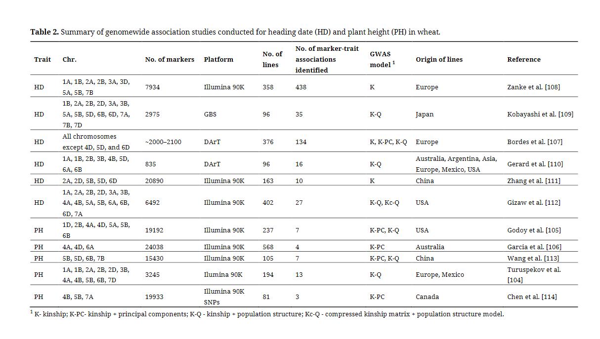 GWAS relies on linkage disequilibrium, the non-random association of alleles at multiple loci, to identify significant marker-trait associations [98]. The high rate of recombination events of diverse (or natural) populations used in association analyses allows a better mapping resolution compared to traditional linkage or QTL mapping approaches [99]. Information from GWAS could be used for marker-assisted breeding, for introgression of important genes across populations, gene cloning, assessment of genetic diversity, and identification of causative loci, functional markers, and alleles [100–103]. Previous studies have used a GWAS approach to identify key regions in the genome controlling plant height and heading date in wheat using different marker platforms such as DArT, Illumina SNP chips, and GBS-derived SNP markers (Table 2). Genetic mapping for plant height revealed the influence of the major Rht genes in controlling the trait across different wheat breeding populations. In addition, genetic loci independent of the major Rht genes previously mapped on 4B and 4D have been identified in other chromosomes such as 1A, 1D, 2B, 3B, 5B, 6A, 6B, and 7D [104–106], indicating the complex genetic architecture for plant stature in wheat. Likewise, for heading date, the major genes involved in response to photoperiod and vernalization have been identified through previous association mapping studies [107–109]. Marker-trait associations for heading date were mapped to different chromosomal regions not associated with the Ppd and Vrn genes, also demonstrating the genetic complexity of the trait.