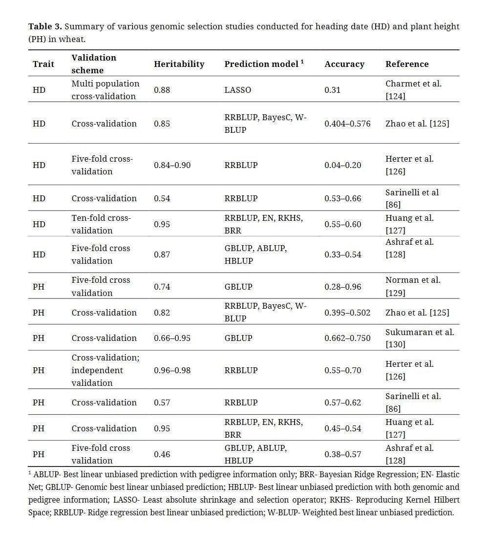The limitation of association genetics, however, lies on the fact that complex traits are controlled by multiple loci with minor effects which cannot always be identified by a standard GWAS approach. In addition, unexpected LD, low allele frequency, small effects size, and genetic heterogeneity remain an issue for the implementation of GWAS [115]. A complementary method, genomic selection (GS) [116] has thus been proposed, with pioneering works in livestock species and later implemented to plant systems. In GS, a selection model is trained using a training set [a population with phenotype and genotype data] and the performance (i.e., breeding values) of lines belonging to the validation or test set [unphenotyped population with genotypic information] is predicted [117]. GS therefore estimates the “genetic worth” of an individual through the calculation of genomic estimated breeding values, which could be a selection criterion in identifying potential parents or superior lines to advance in the breeding program [118]. Previous GS studies demonstrated moderate to high prediction ability for both heading date and plant height, where heritability was related to improved predictions (Table 3). Overall, heading date was observed to have lower predictability compared to plant height, which suggests that it has a more complex genetic architecture than the latter. It should be emphasized, however, that the accuracy of predictions in GS is not only affected by heritability but also by other factors such as training population size, relatedness between training and test populations, type of prediction model used, validation type implemented, and number of markers [119–123]. GS complements observations from GWAS regarding the genetic complexity of heading date and plant height in wheat.