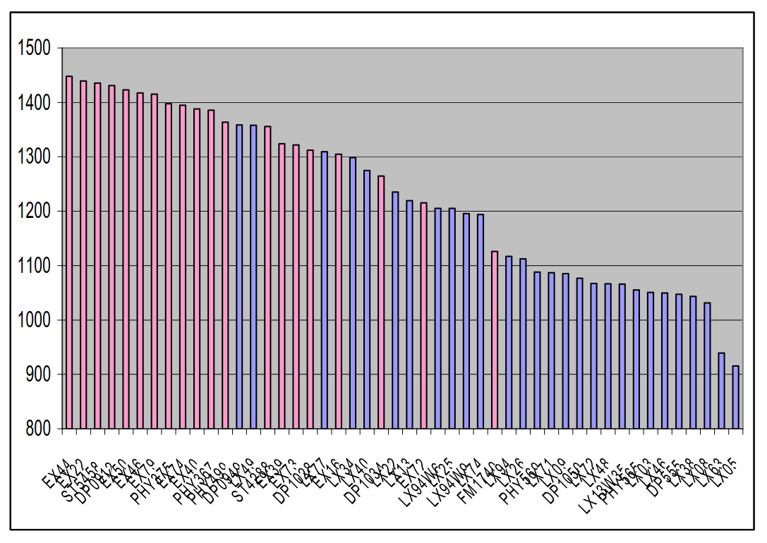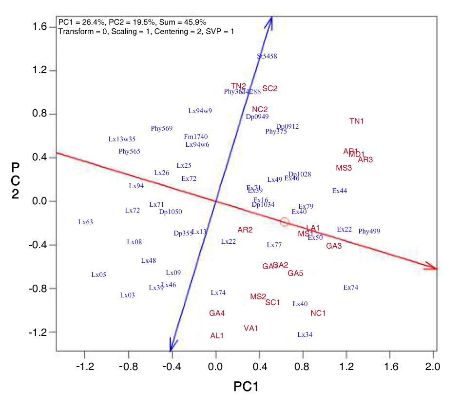 The GGE Biplot analysis of Corteva’s “Elite Strains” test in 2010 with both early-mid and late maturity as well as both conventional and transgenic entries will be used to demonstrate the utility of GGE Biplot to cotton trial analysis. The trial had three or four replications of 48 entries in a randomized complete block design at 21 test locations from Louisiana to Virginia. Locations were coded by the two-letter state abbreviation and a serial number. Conventional experimental lines were coded with an “Ex” or “Lx” prefix indicating early-mid or late breeding program genotypes.