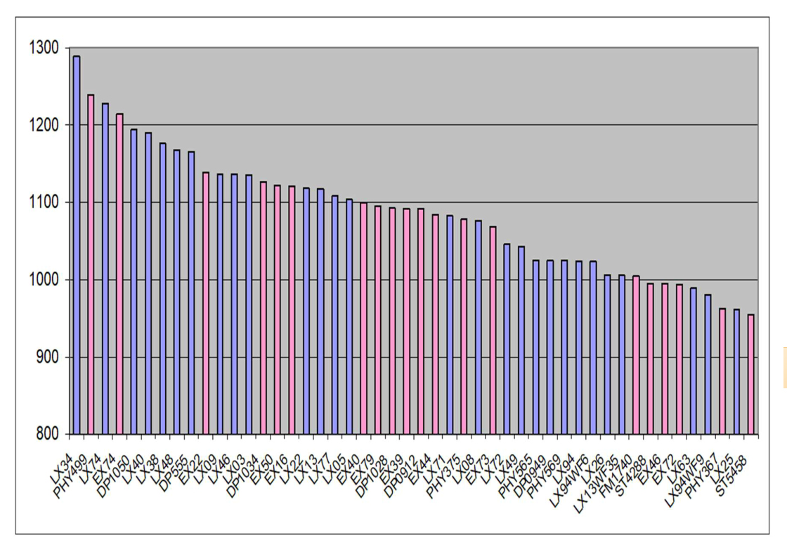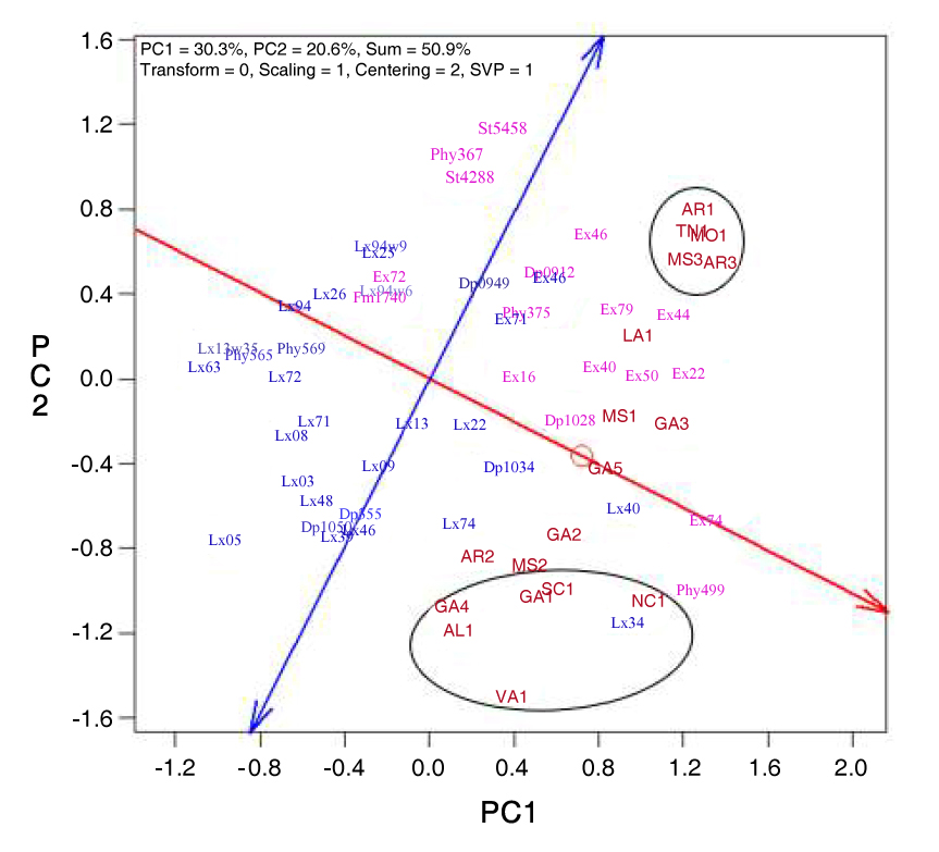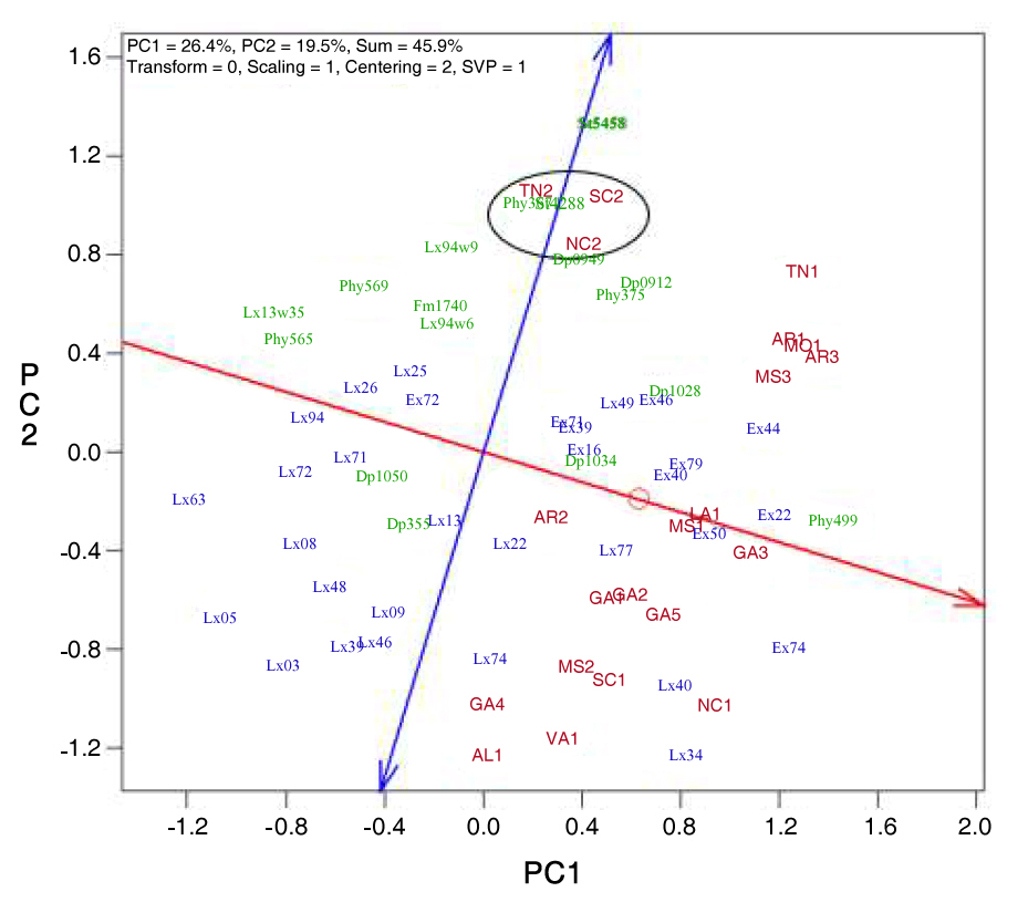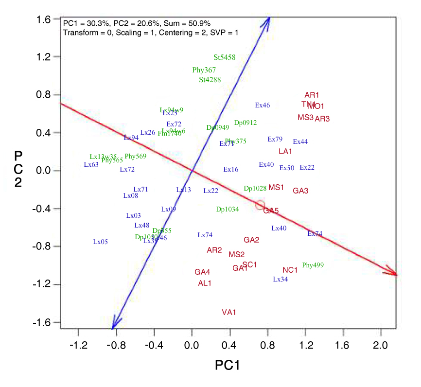 One of the most useful aspects of the GGE Biplot software [5] is the ability to quickly and easily eliminate either genotypes or environments based on both the biplot and the breeder’s knowledge of the genotypes and environments being displayed. A biplot with environments falling to the left of the blue line perpendicular to the red ATC line indicates a complex G × E interaction with genotype performance at those locations being negatively correlated with overall mean performance. While a 3-D view of GGE Biplot may be useful in this case, our approach has been to subset the dataset according to knowledge of genotypes and environments, particularly relative to varietal maturity. The ability to easily get back to the original dataset enables an interactive approach to data analysis.