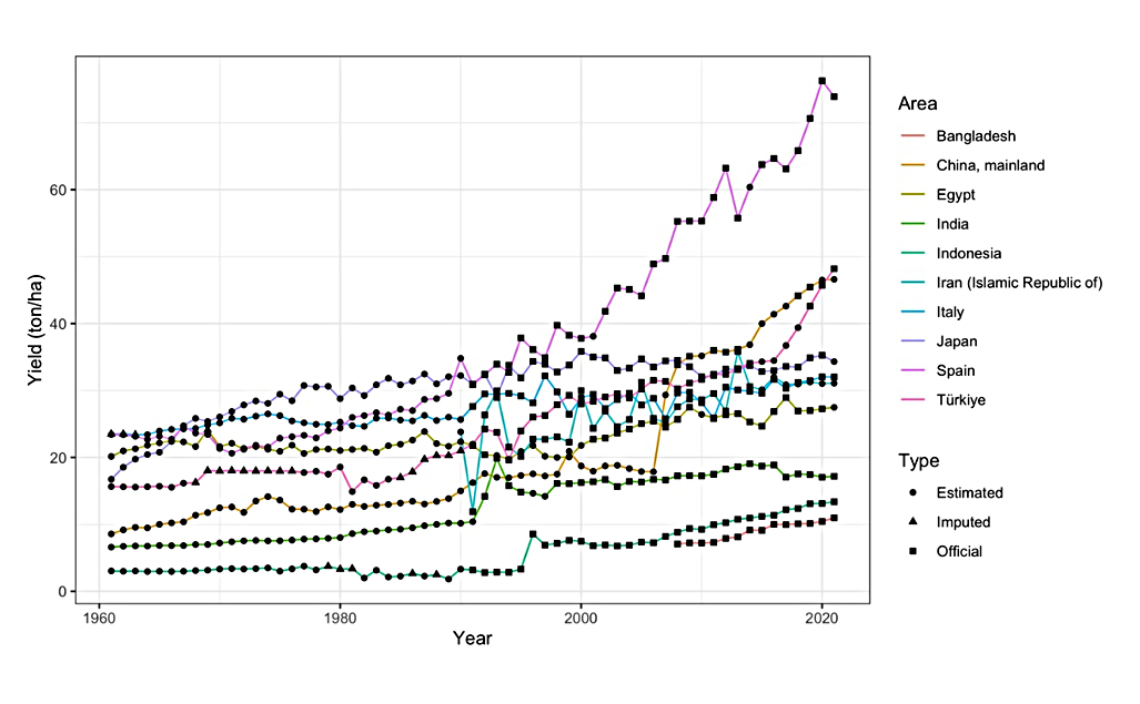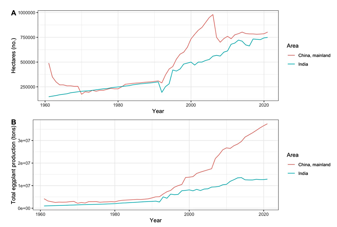 Eggplant (Solanum melongena L., 2n = 24) is the third most widely cultivated solanaceous vegetable crop after potatoes and tomatoes. Since FAOSTAT data collection began in 1961, the global production of eggplant has climbed gradually, reaching roughly 56 million tons in 2020 [1]. India and southern China are the two most commonly proposed places of origin since they have similarly ancient written evidence of eggplant use dating back about 2000 years [2]. China and India produce more than 80% of the world’s eggplant production [1,3,4]. There are approximately 750,000 total hectares dedicated to eggplant cultivation in both China and India (Figure 1). India exceeded 10,000,000 tons of eggplant produced in 2020 while China exceeded 30,000,000 tons of eggplants. Yield per unit of land has increased but it ranges widely from over 76 tons/ha to under 2 tons/ha across the ten nations which have the greatest cumulative eggplant production (Figure 2).