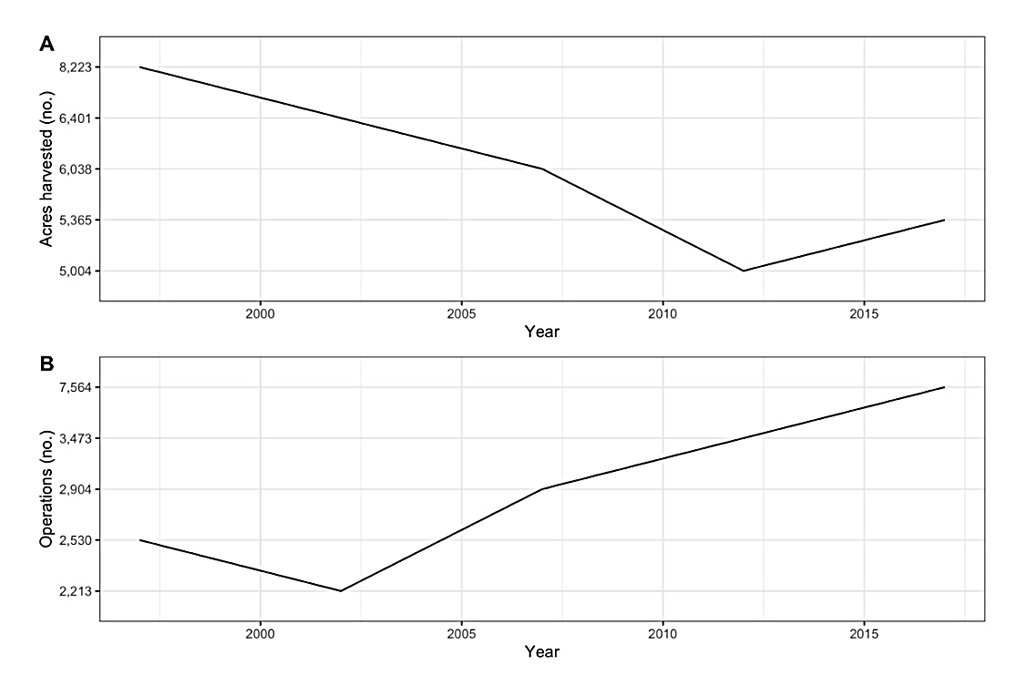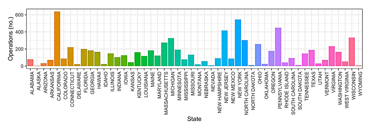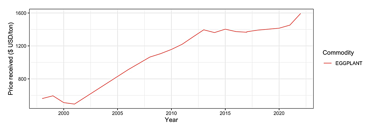 In the U.S., eggplants are predominately grown for fresh market, with 7564 operations with area harvested across 5365 acres based on the 2017 USDA Agriculture Census (Figure 3) [5]. The top five U.S. states based on acres harvested are New Jersey (n = 849), California (n = 705), Florida (n = 685), Georgia (n = 624), and New York (n = 264). The top five based on total number of operations with area harvested are California (n = 638), New York (n = 546), Pennsylvania (n = 449), New Jersey (n = 416) and Wisconsin (n = 332) (Figure 4). The price received by producers has increased from below 500 USD/ton in the late 1990s and early 2000s to over 1400 USD/ton in the early 2020s (Figure 5).