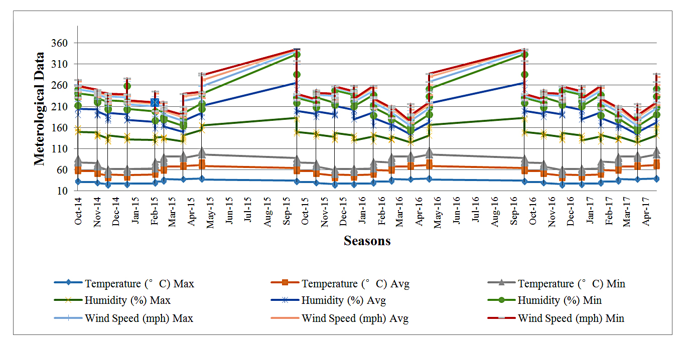 Field ExperimentsThe field trials were carried out during three consecutive rabi seasons 2014–15, 2015–16, and 2016–17 at the ICAR-Indian Agricultural Research Institute, Regional Station, Indore, Madhya Pradesh India. The experimental field is situated between 22°37′ N latitude to 75°50′ E longitude at 557 m above Mean Sea Level (MSL) having semi-arid and tropical climate with temperatures shifting from 23 °C to 41 °C and 7 °C to 29 °C in summer and winter seasons, separately, in January before flowering 7 °C to 24 °C and in February after flowering from 23 °C to 31 °C (Figure 1). In this area, most of the rainfall is received during south-west monsoon, i.e., between June to September, with occasional showers in winter. The sowing was done on the 7th of December each season, which corresponds to late sown conditions as a way to maximize exposure to higher temperatures during the flowering transition. Sowing was done in beds having length of 2.5 m in two row plots with a row to row spacing of 18 cm. The experimental design was a randomize block design (RBD) with three replications. Four gravity irrigations of 30 mm were provided during the crop cycle: germination irrigation just after sowing, vegetative stage between 30 to 40 days after sowing, flowering time 55 to 60 days after sowing, and milking stage 80 to 90 days from date of sowing. Recommended agronomical practices were followed to ensure no inputs deficiencies and minimize external effects. All agronomic parameters were recorded (days to heading [39], days to maturity, spike length, number of grains/spike, grain yield/plant, harvest index, and biomass) and several rheological traits (hectoliter weight, yellow pigment, sedimentation value, and 1000 grain weight).