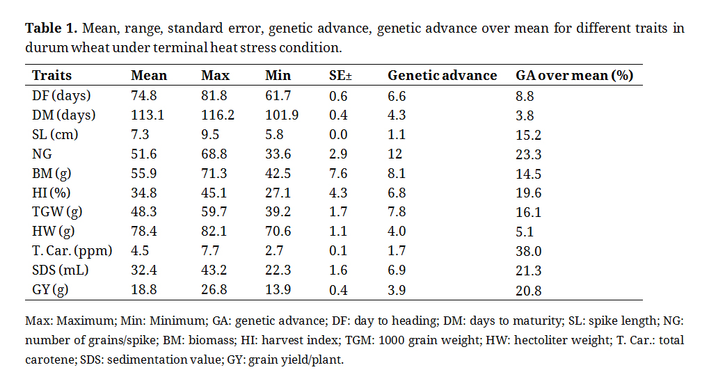 Maximum expected genetic advance was observed for total carotene, number of grains per spike, sedimentation value, grain yield/plant and harvest index promoting these for breeding selection [53]. Especially, those traits with high heritability and high genetic advance are the most interesting targets for breeders [54–56]. Bijaga Red, Bijaga yellow, CDW 04, HI 8627, IWP 5070, MACS 1967, MACS 3125, B 447-BA, Raj 6516, V 21/23, Vijay and WH 912 were the most adaptable genotypes for grain yield, were the most adaptable genotypes for grain yield, similarly A 206, GW 1170, HI 7747, NP 4 and Vijay were the most stable genotypes and Vijay was the most adaptable and stable genotypes for grain yield under terminal heat stress condition [57,58].