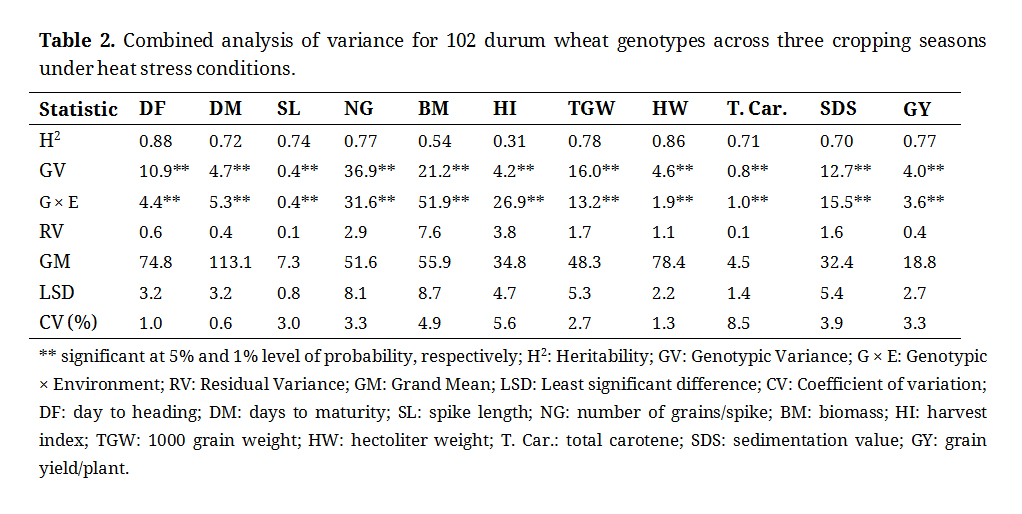 The abrupt increase of temperatures during and after the flowering period of wheat is defined as terminal heat stress, and it causes severe reductions in productivity. One hundred two durum wheat lines were evaluated against this stress for three consecutive cropping seasons (2014–2017) in Indore, Madya Pradesh (India). The main objectives were to assess their grain yield potential, stability, and rheological quality characteristics under these conditions, and identify other contributing traits to adaptation. Combined ANOVA across environments showed significant differences (P < 0.01) for all factors, and high broad sense heritability was recorded for hectoliter weight, 1000-grains weight, grain yield, number of grains per spike, spike length, days to maturity, total carotene and sedimentation values. Grain yield showed significant (P < 0.01) positive associated with biomass, harvest index, hectoliter weight and significant negative associations with day to heading and maturity. Genotypes showed explicit variation to environmental condition as supported by significant (P < 0.01) for genotype × environment interaction (GEI). The traits like early heading, maturing, high biomass and hectoliter weight were the most critical traits for adaptation under terminal heat stress. To determine effects of GEI data were subjected to GGE biplot analysis, which identified as the most stable and performing across seasons G-30 (GW 1240) for hectoliter weight and G-98 (Vijay) for grain yield. These entries can now be combined via breeding to develop superior heat stress tolerant varieties.