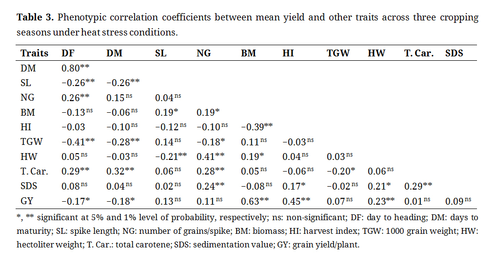 The following supplementary materials are available online at https://doi.org/10.20900/cbgg20230004. Supplementary Table S1: List of genotypes used in the experiment. Supplementary Table S2: Mean value of selected traits based on BLUEs of genotypes 2014–2017. Supplementary Table S3: Analysis of variance of principle components of biplot genotype and location of the traits across three cropping seasons under heat stress conditions. Supplementary Table S4: Performance of genotypes for adaptability, stability and both genotypic adaptability and stability for all the selected traits under terminal heat stress conditions. Supplementary Figure S1: The biplot based on the correlation data for grain yield with other yield contributing traits. It explained 69.74% of the total G + GE where PC1 and PC2 accounted for 42.36% and 27.38% of variance respectively.