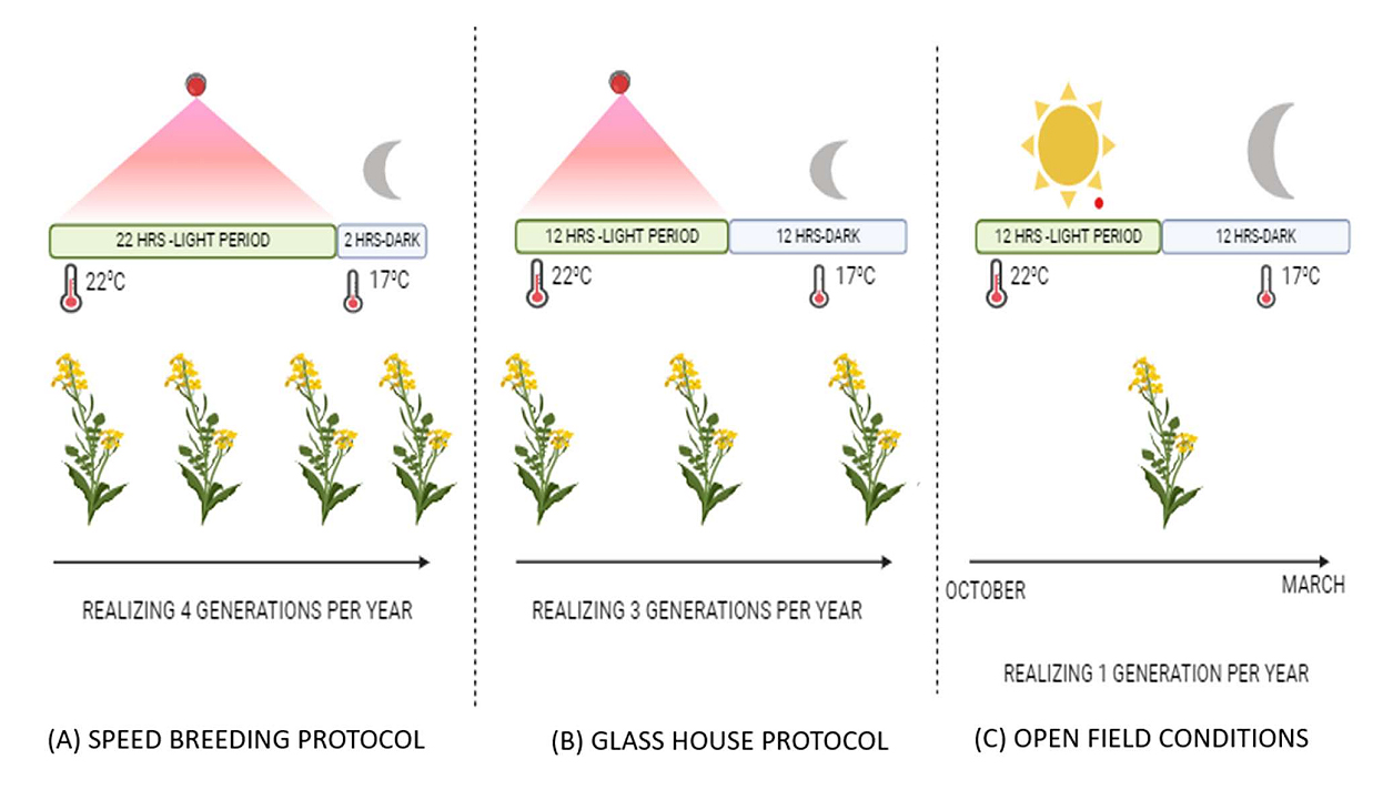 SB has taken the plant breeding to the next level by allowing 4–6 generations in a year. As compared to glasshouse (12 h sunlight, 12 h dark), SB chamber (22 h artificial light, 2 h dark) produced four generations of canola. While, glasshouse could produce 3 generations and open field only one generation of canola.