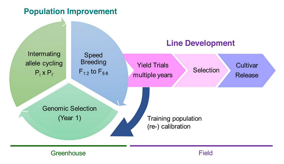 Another option where SB can be integrated with modern breeding tools is the integration of SB and genomic selection (GS) in a plant breeding program to accelerate genetic gain [27]. In this case, the population improvement component has the goal of increasing the allelic frequencies of favourable alleles in the population. Selection can be conducted at different levels in breeding programmes, but there is no need to wait until lines are completely homozygous to perform the crossing. SB can enable fast cycling in the genomic recurrent selection component. The line development component has the goal of testing inbred lines and selecting fixed lines to release as cultivars or to further use in hybrid production. Field testing is required at this stage [18]. Genomic prediction can further aid in the selection of parents by deploying training populations with extensive field evaluations. The line development program will provide phenotypic information for re-calibrating the models for genomic selection and should, therefore, be carefully planned for predictive ability. SB can be used to accelerate the inbreeding process [70].